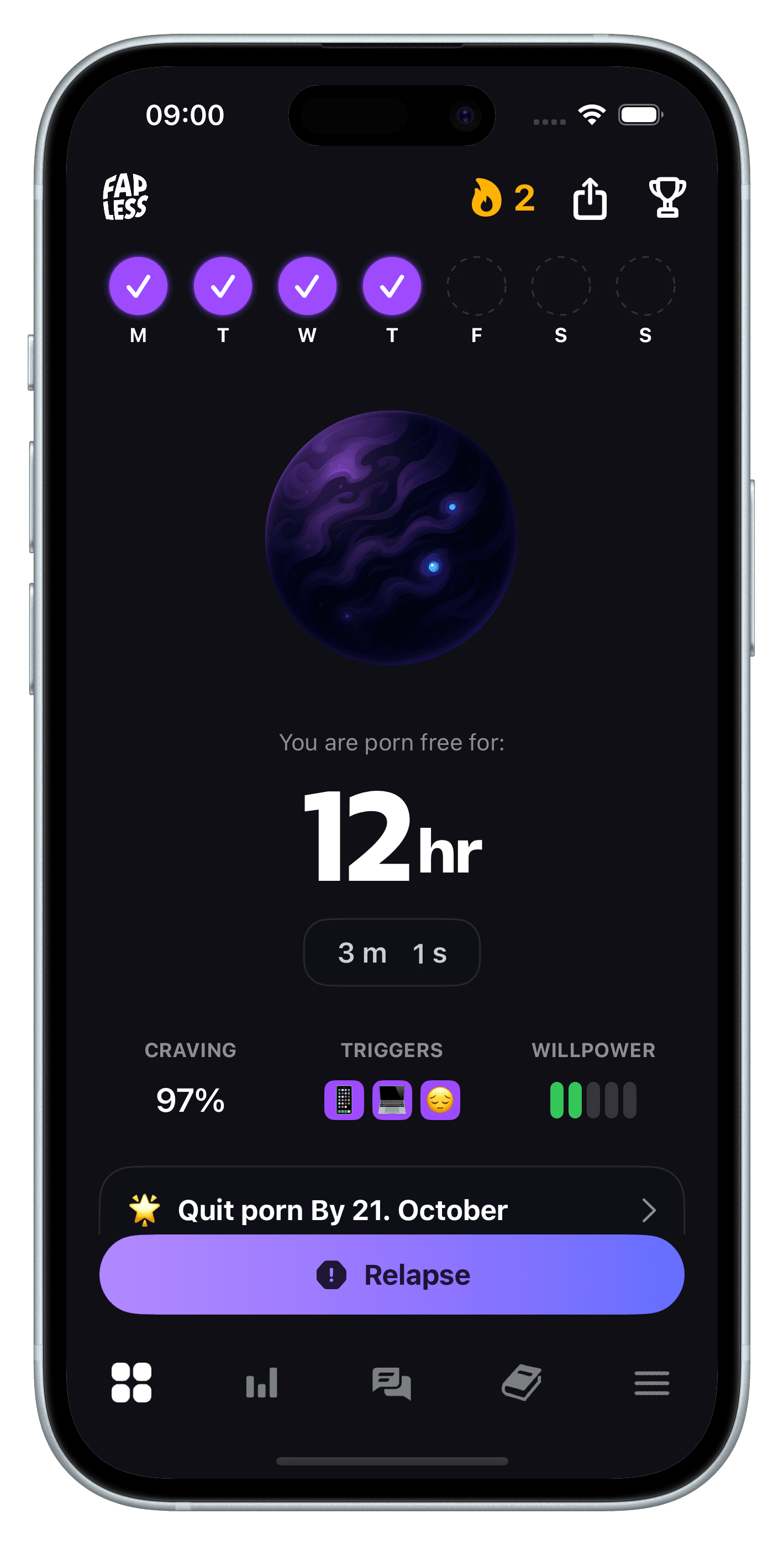 FAPLESS helps you defeat your porn addiction on a gamified way. Daily Tracking, AI Coach and a personalized training. Start now.